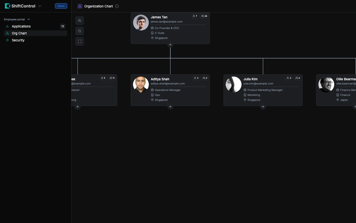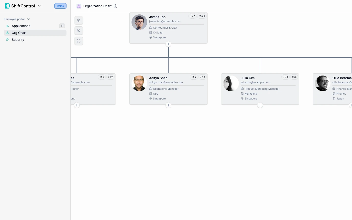 The Org Chart in ShiftControl shows your organization's structure visually. You can: