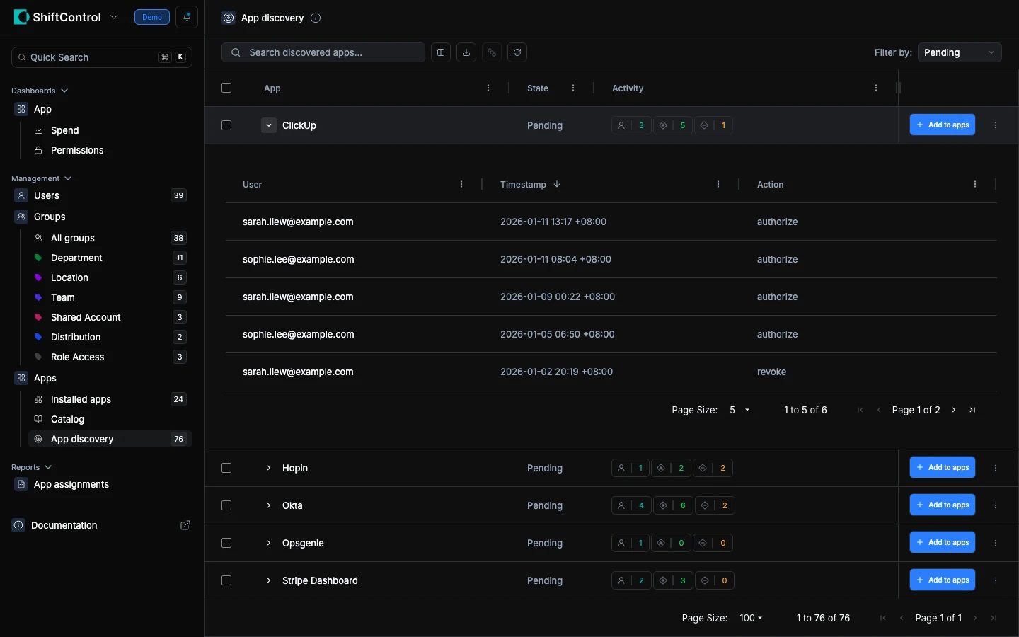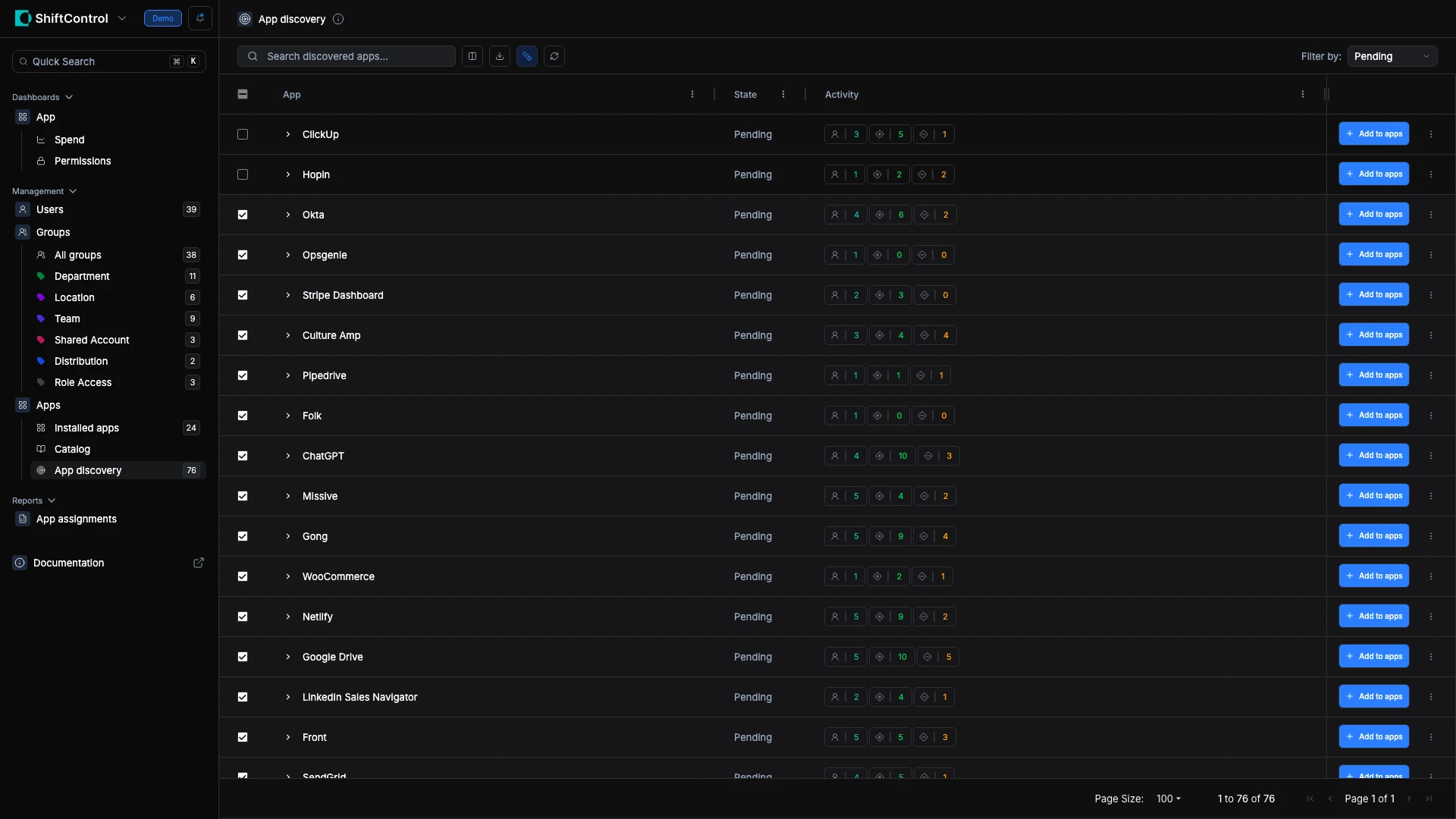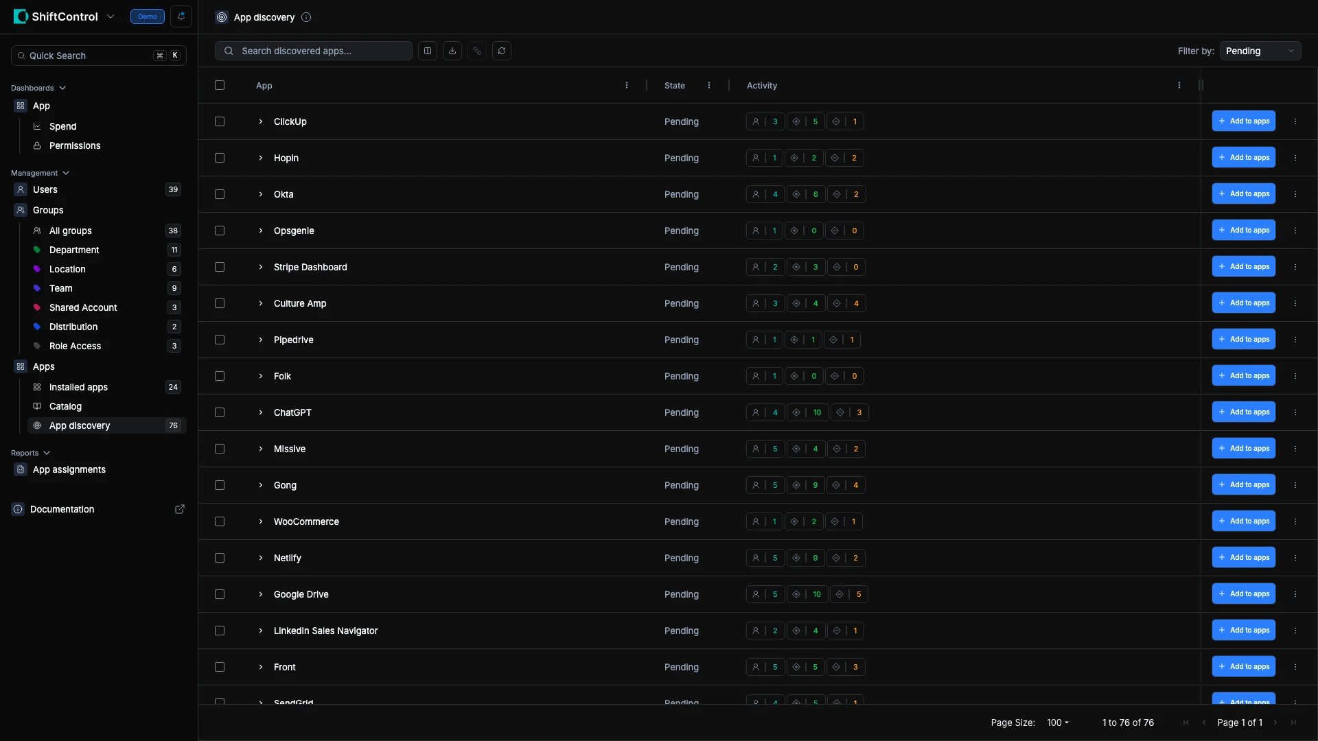 You filter by Pending and review apps that have been discovered but not yet addressed. Apps with only one user and minimal activity can be dismissed. Apps with broad adoption should be added and managed.