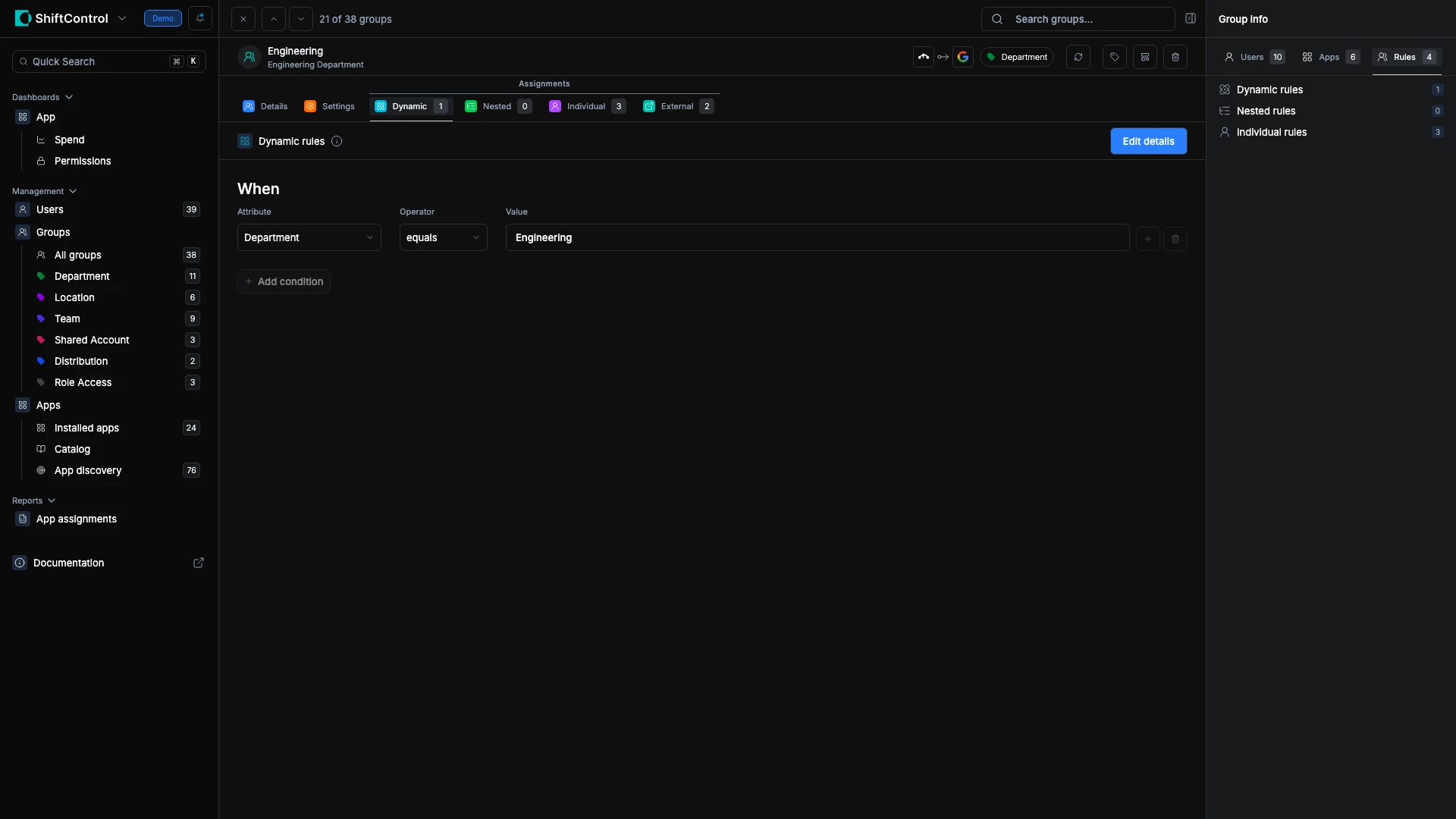 Editing a group is where you define who belongs to it, and by extension, who gets access to the apps assigned to that group. ShiftControl provides three rule types that you can use individually or combine to build exactly the membership you need:
