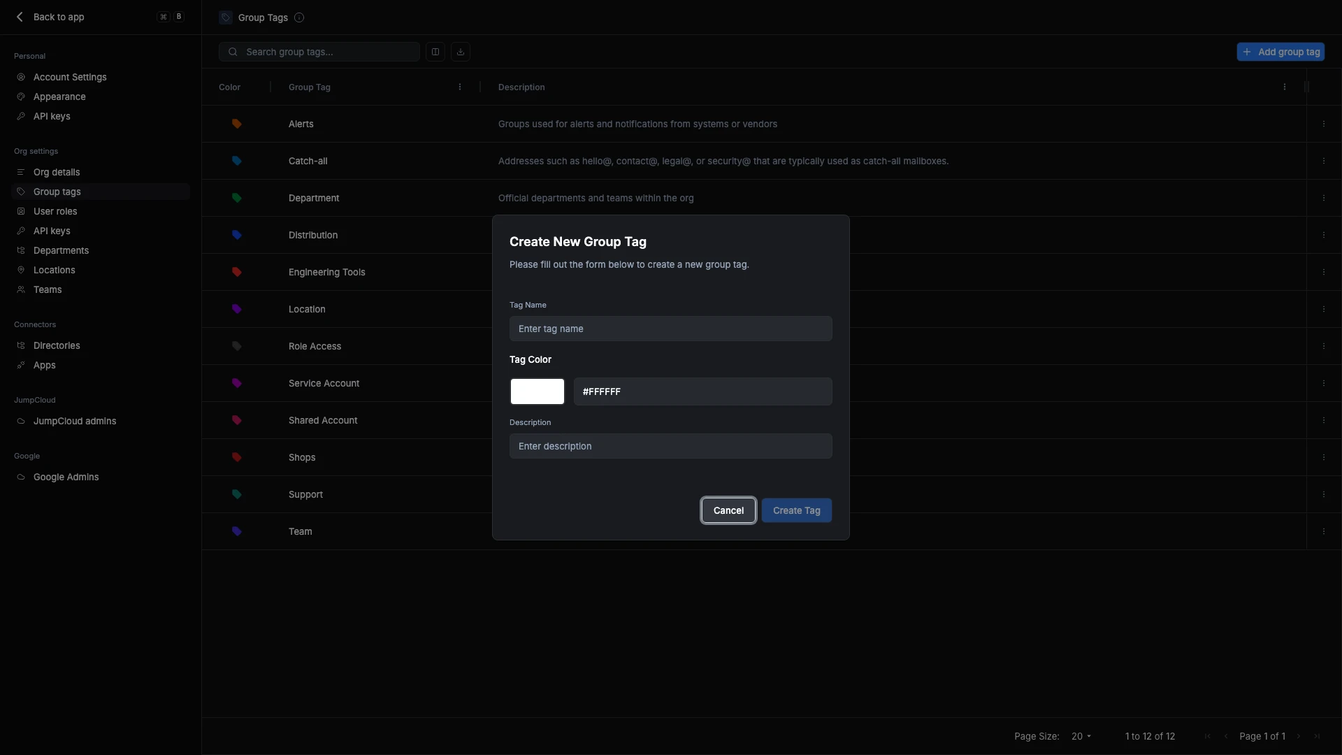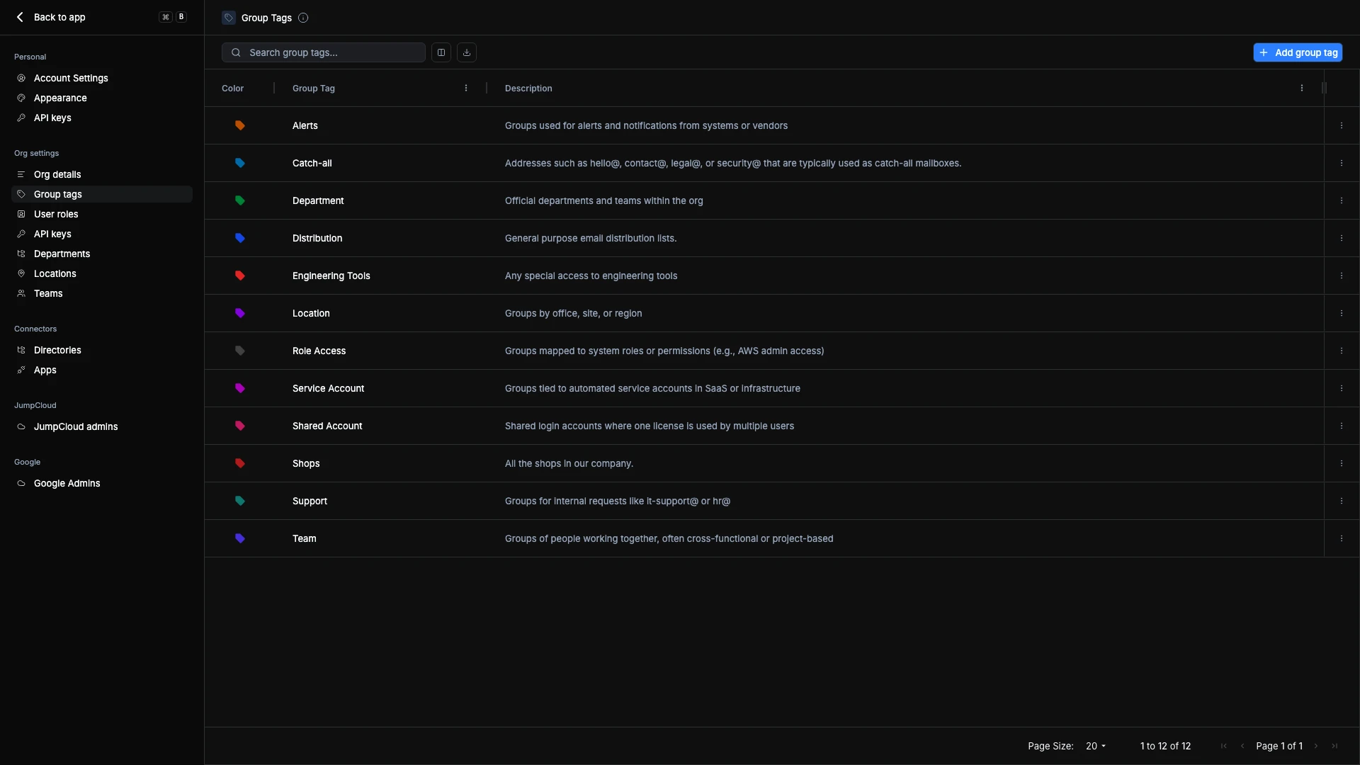 Group tags serve as reusable labels to categorize groups within your organization. They make it easier to organize, search, and automate group-related workflows. Administrators often use tags to represent team function, access level, or organizational purpose.