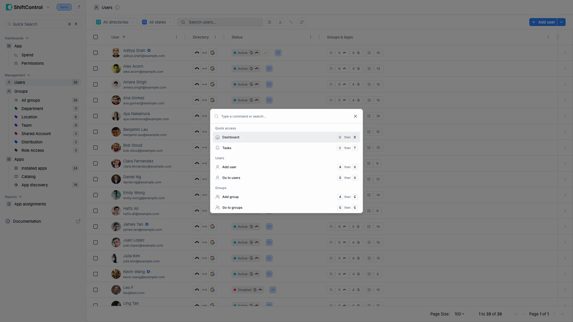 AthenU) from anywhere in ShiftControl to jump straight to an action such as adding a user. You do not need to open the Command Bar first -- shortcuts work directly from any page.